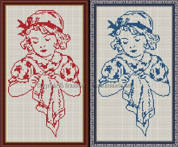 Modèle de broderie au point de croix monochrome représentant une enfant en train de broder. Très concentrée sur son ouvrage, elle porte une robe et une coiffe de style 1930.